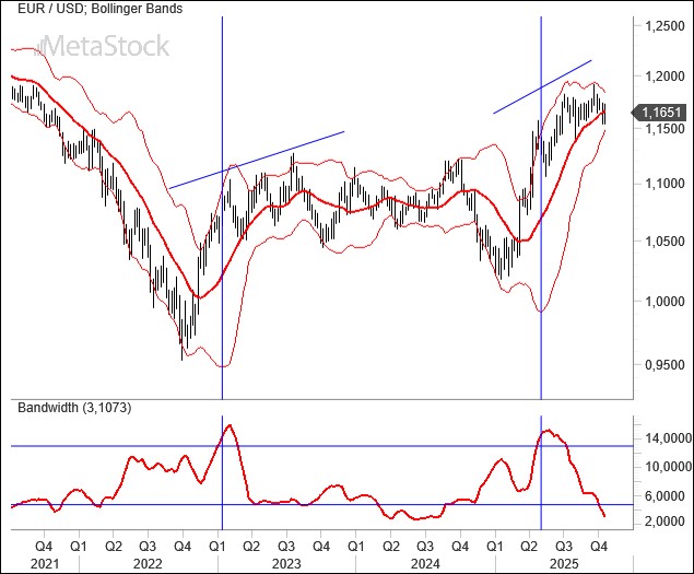 EUR/USD is caught between decisive technical levels, lacking direction as traders await the next catalyst. Volatility indicators confirm this indecision, with the upper and lower Bollinger Bands tightening sharply – a pattern that has historically preceded significant moves in the months that follow.