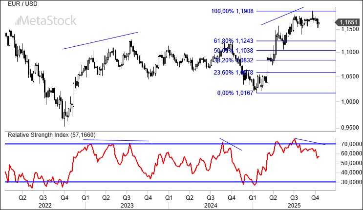 From a technical perspective, divergences between price action and weekly oscillators had signaled a correction, which appears to have found its first major support area around 1.1500–1.1570. That zone has so far held firm. Should it break, the pair could slide toward 1.1250, which analysts see as the dollar’s most optimistic short-term target.