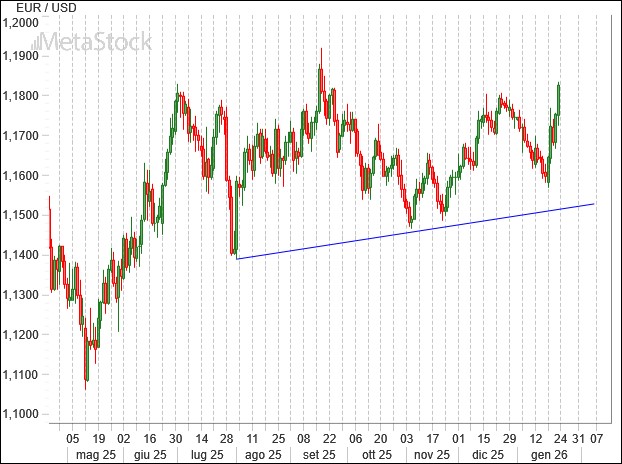 That phase is gradually repositioning EUR/USD toward its moving average. Should a downside break occur, the outlook for the dollar would become more constructive. For now, however, this scenario appears unlikely, and a dramatic upside breakout—opening the door to ambitious bullish targets for the spring—cannot be ruled out.